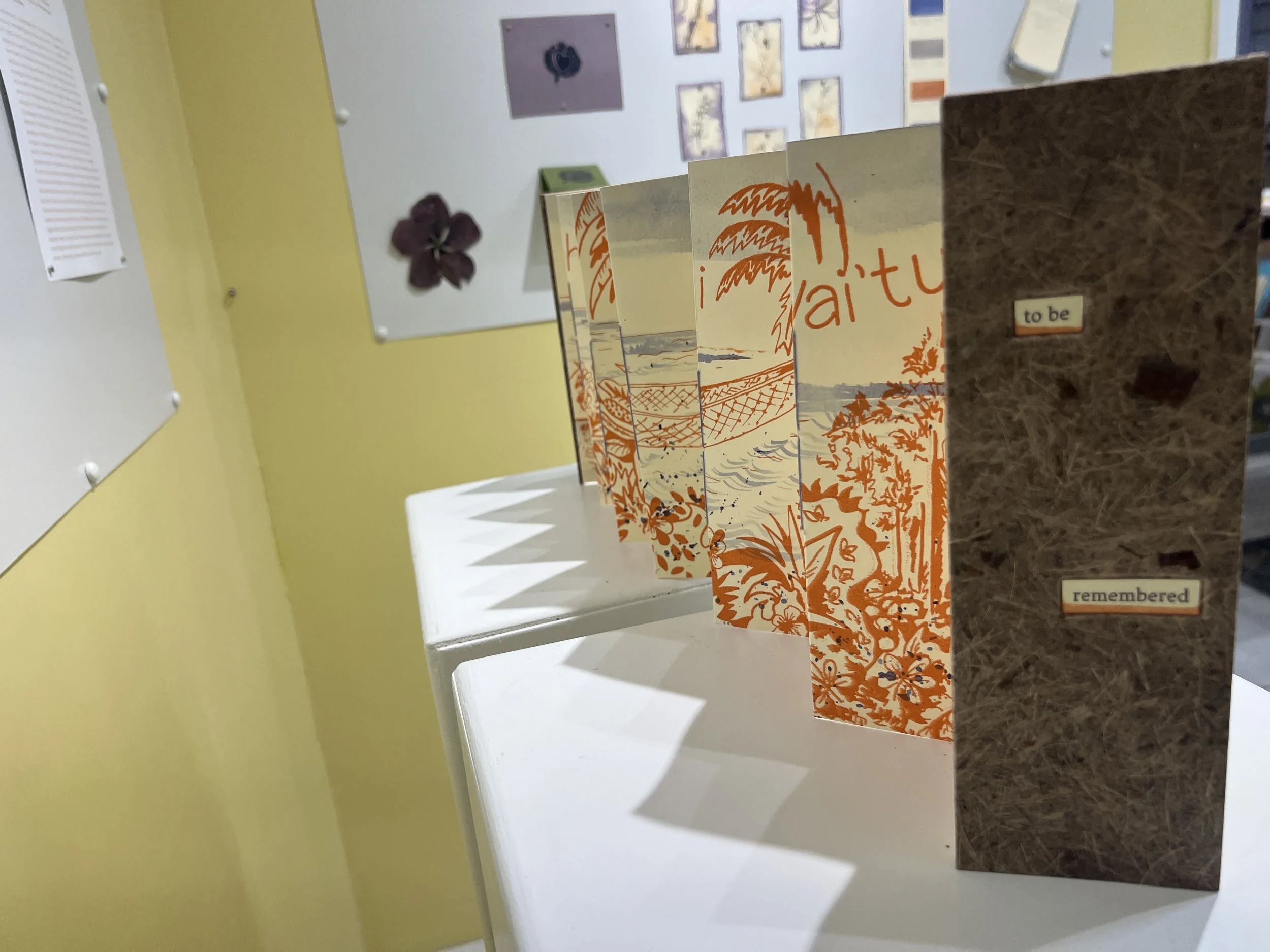 Accordion fold book, silkscreen and letterpress-printed, with hand applied natural dyes from cocoplum, logwood, and rouccou, and handmade paper covers using banana and sisal fibers.