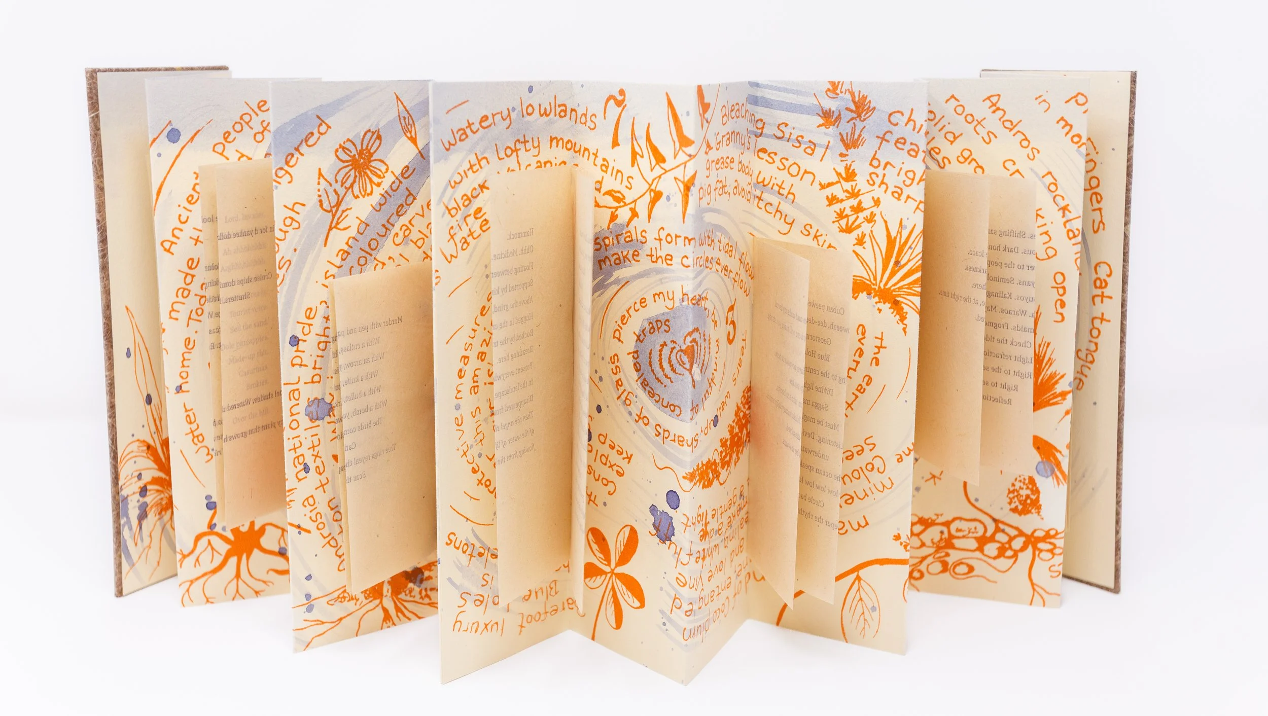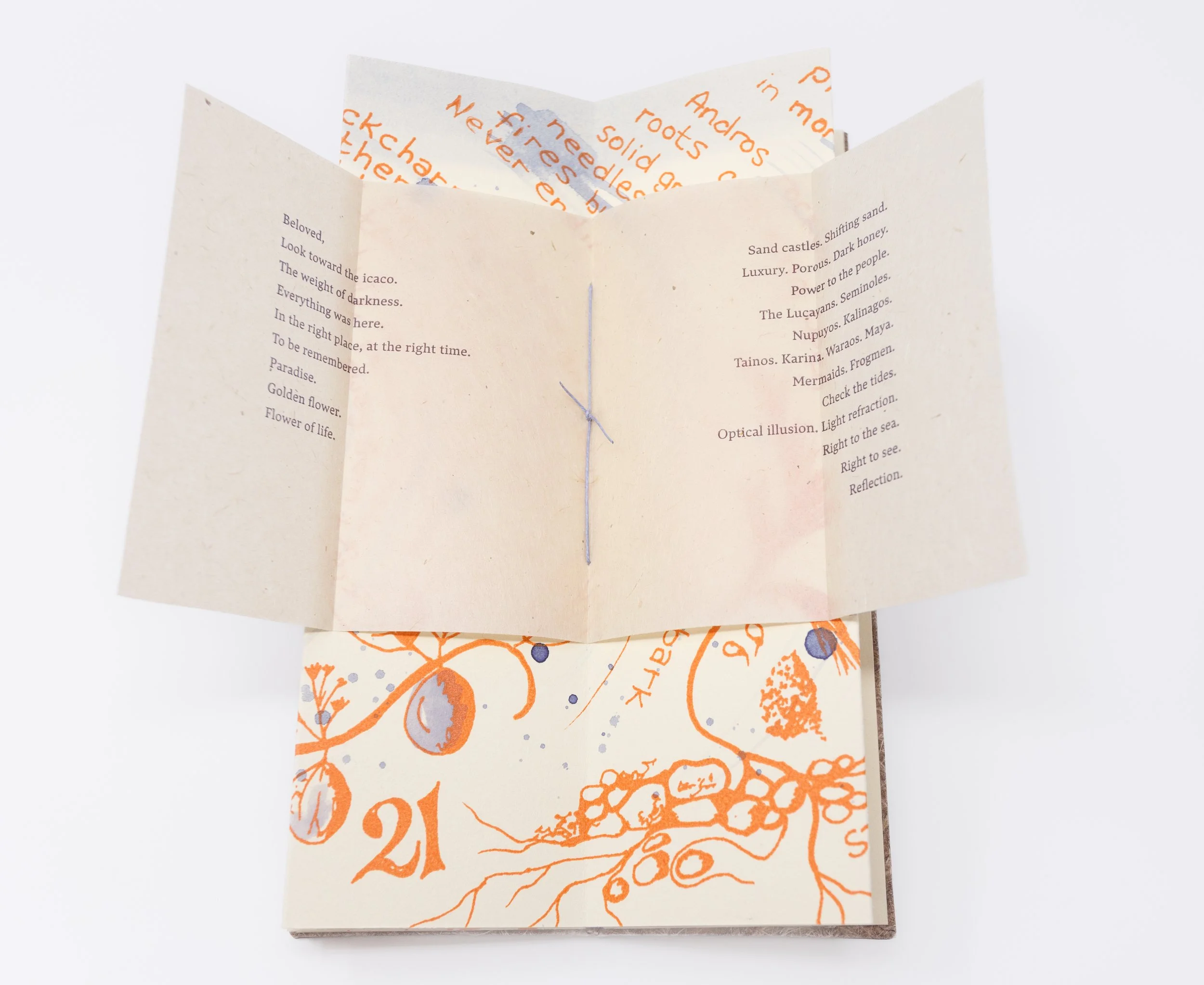 I wrote the main poem, which was set in Lava from Typotheque, and letterpress-printed onto Kitakata papers, then hand-sewn into the accordion with thread dyed using cocoplums. Writing and illustrations by Carol Sorhaindo were silkscreen printed onto Rives BFK for the accordion body, with hand applications of color from cocoplum, logwood, and rouccou dyes.